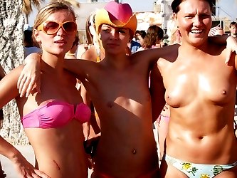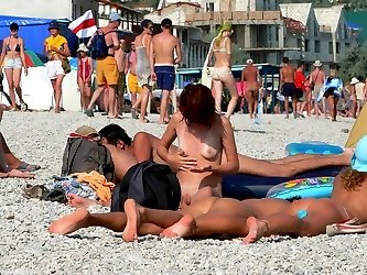 Wild brunette teen dances nude at a public beach